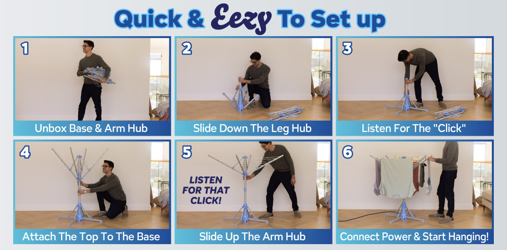 Yes! The Eezy Breezy Smartline is easy to put together, power up and then fold down again! Slot the top together with the bottom, plug it in and with a press of a button on the remote, it begins its non-stop rotation for your choice of 1, 2, or 4 hours, of effortless, fast-drying. And when you’re done, simply fold it away and store it in the cupboard.