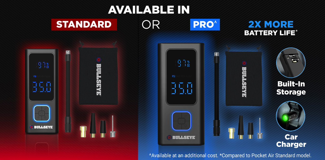 Pocket Air by BULLSEYE is ultra powerful, durable and puts the power of an air compressor in the palm of your hand! It can inflate a tyre from 29 to 34 PSI in 2 minutes*. The Pocket Air by BULLSEYE Max. Pressure is 100 PSI and the Pocket Air PRO by BULLSEYE Max. Pressure is 120 PSI. *Inflation times will vary by tyre, outside temperature, vehicle battery & inflator battery condition. Based on filling a P195/60R15 vehicle tyre from 29 to 34 PSI.