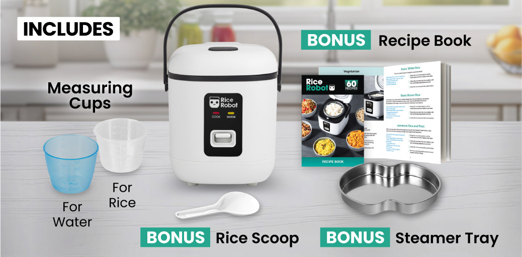 Rice Robot includes 1 x Rice Robot Rice Cooker with a non-stick, ceramic coated inner pot, 1 x clear measuring cup for rice, 1 x blue measuring cup for water and a power cable. Plus, you’ll receive 3 fantastic BONUSES: