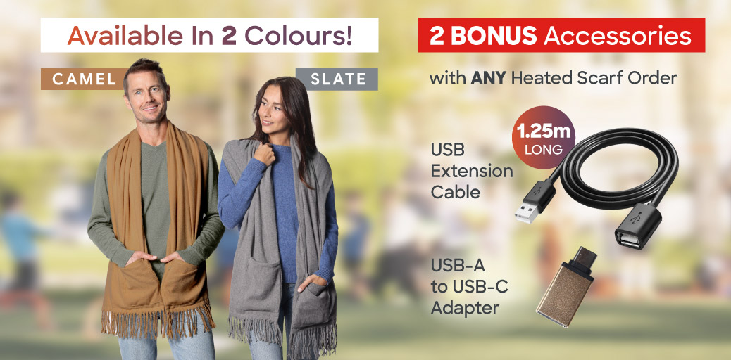 - 1 x Portable Power Bank, so you can heat your scarf anywhere without needing to plug into another device (see FAQs for Power Bank details).