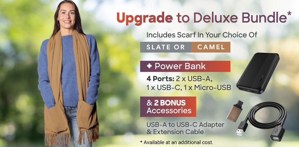 You can power the Sash & Bloom Heated Scarf by plugging it into compatible devices* with a USB-A or USB-C port, such as a power bank, laptop, car, or charger. A BONUS USB extension cable and USB-A to USB-C adapter are included for extra convenience. For the ultimate Sash & Bloom Heated Scarf experience, upgrade to the Deluxe Bundle, which includes a Portable Power Bank to power your Scarf and your other compatible devices on the go! *Compatibility may vary by device. Always read and follow instruction manual for use.
