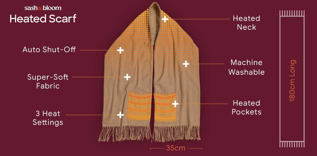 - Soft, stylish scarf with heating pads built-into the neck and pockets